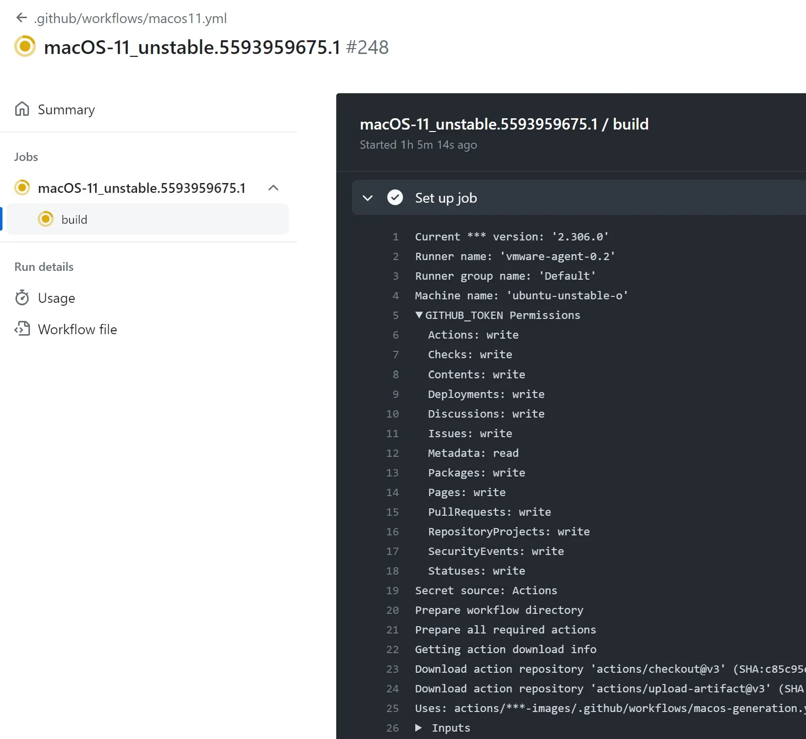 The repository contained several CI workflows that used self-hosted runners to build Windows and MacOS runner images. Below is a workflow run from a build that ran on one of the non-ephemeral self-hosted runners attached to the repository. Note the write permissions associated with the GITHUB_TOKEN!
