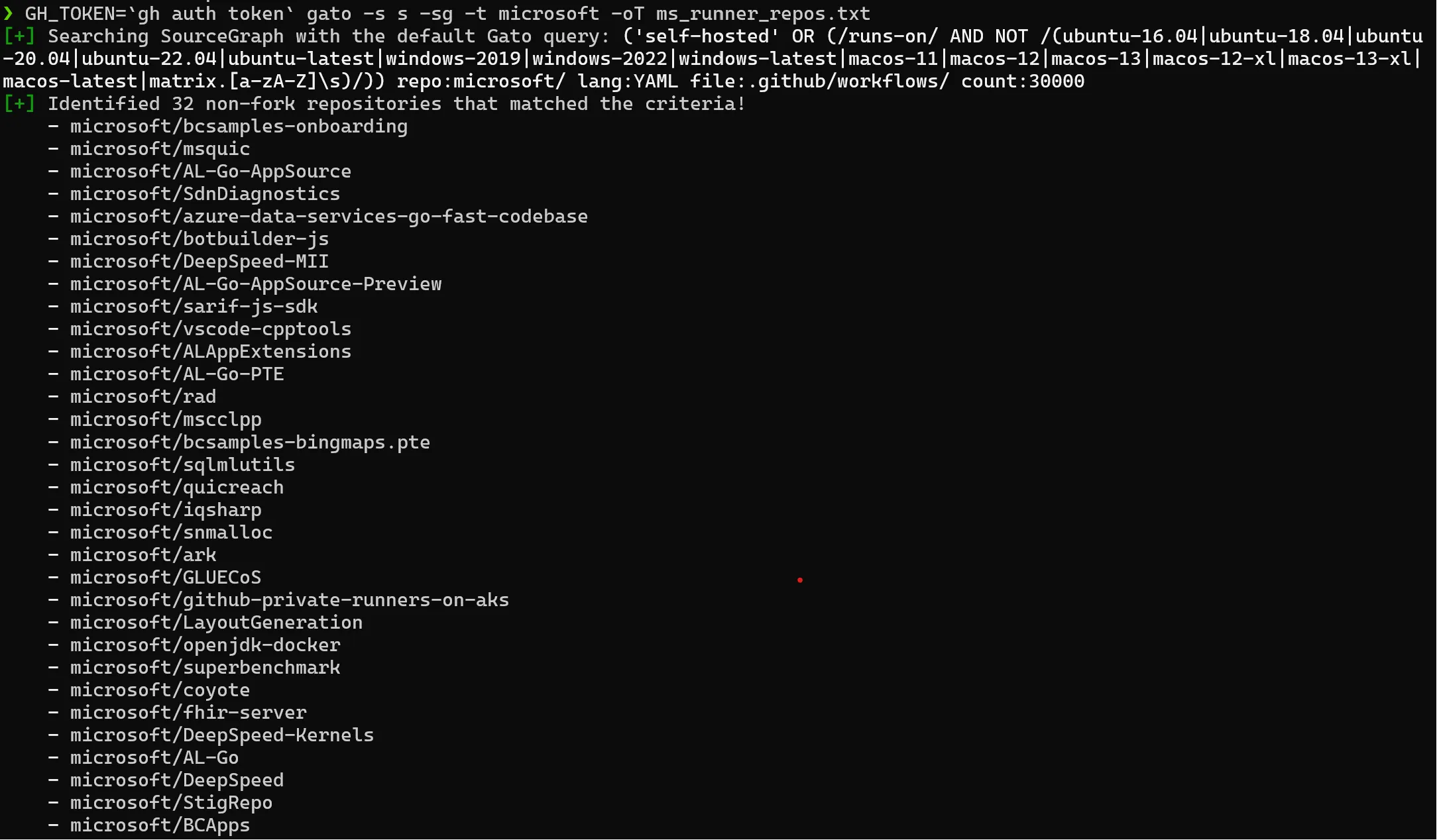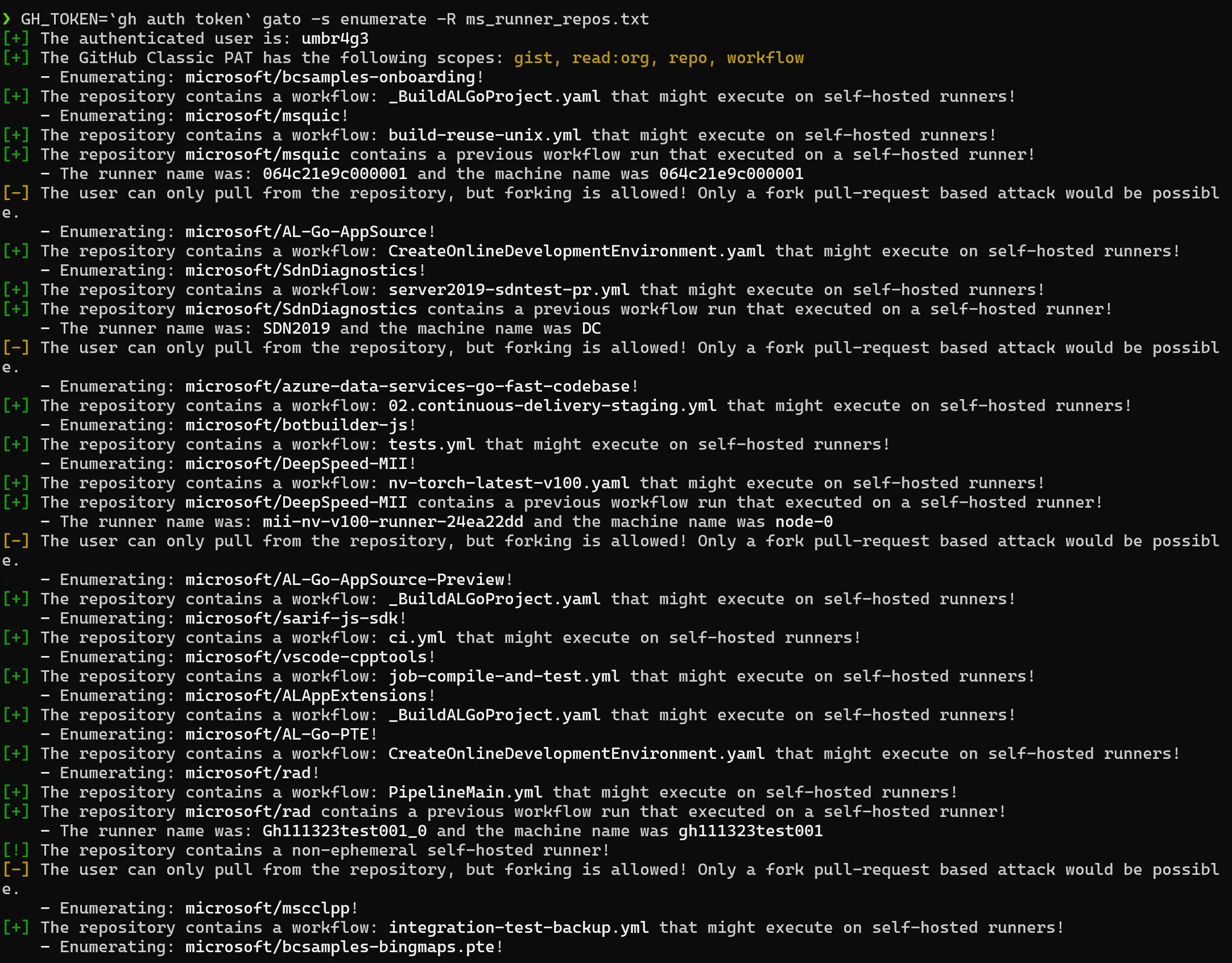 Check out an example of how easily Gato can discover self-hosted runners on Microsoft’s public repositories with just two commands.