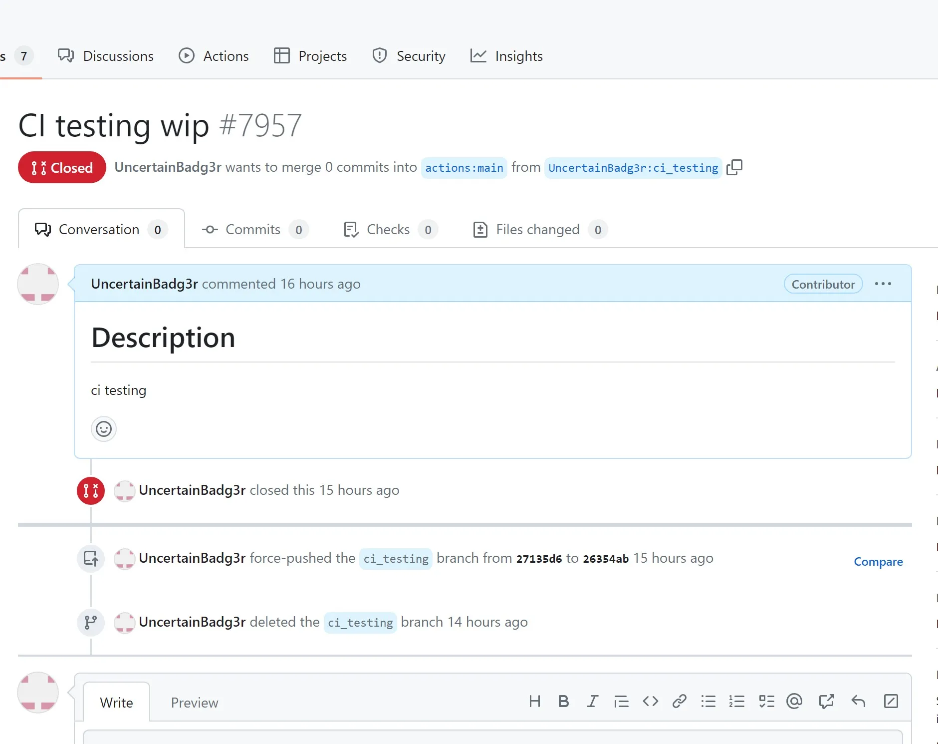 Once the pull request was merged, my account was a contributor, note the ‘Contributor’ badge that now shows up in the box. This meant that my account could execute workflows on pull_request without approval, as long as the repository had the default approval setting, which it did at the time.