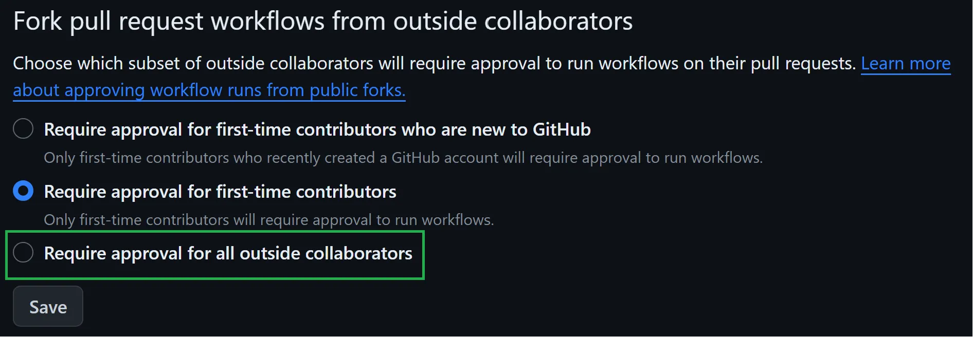 The easiest way to mitigate this class of vulnerability is to change the default setting of ‘Require approval for first-time contributors’ to ‘Require approval for all outside collaborators’. It is a no-brainer for any public repository that uses self-hosted runners to ensure that they are using the restrictive setting.