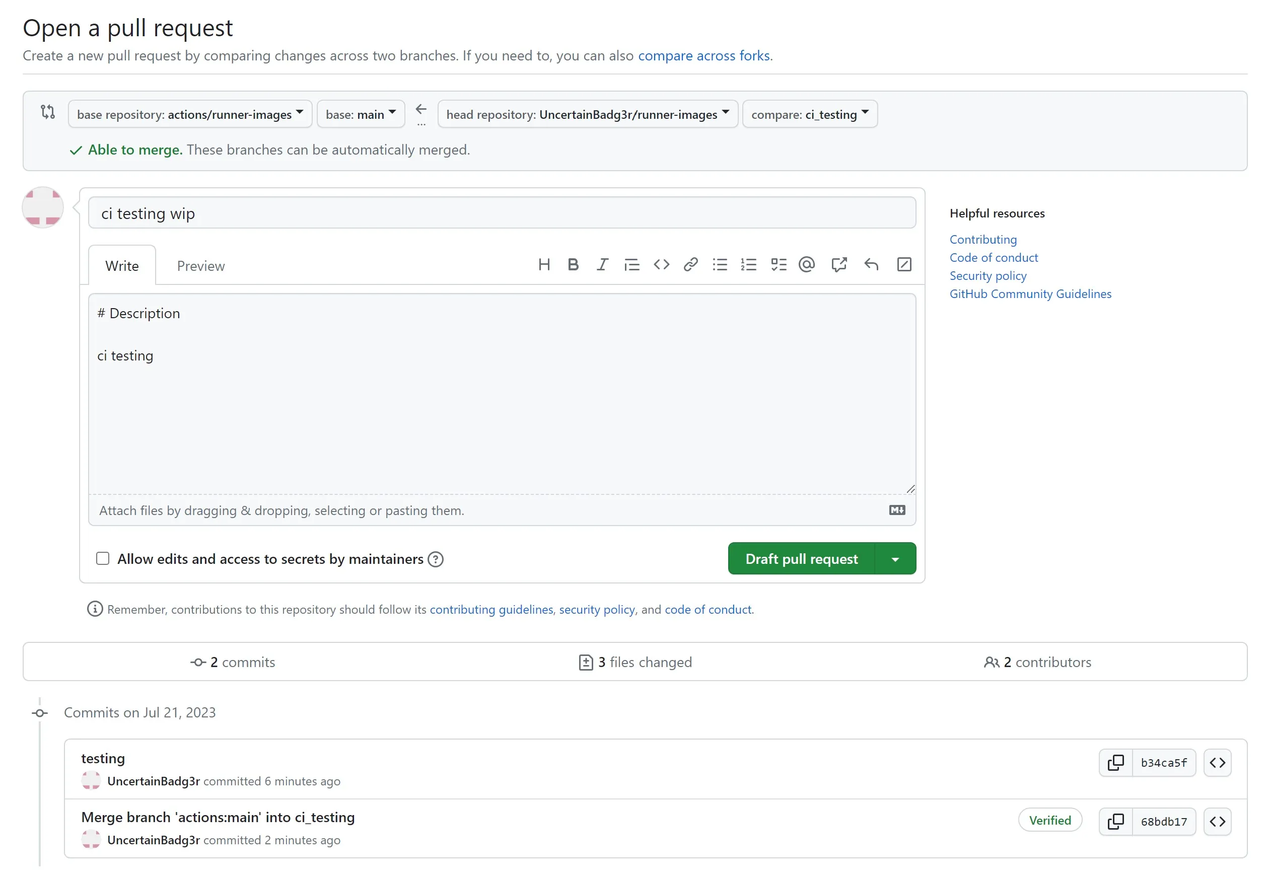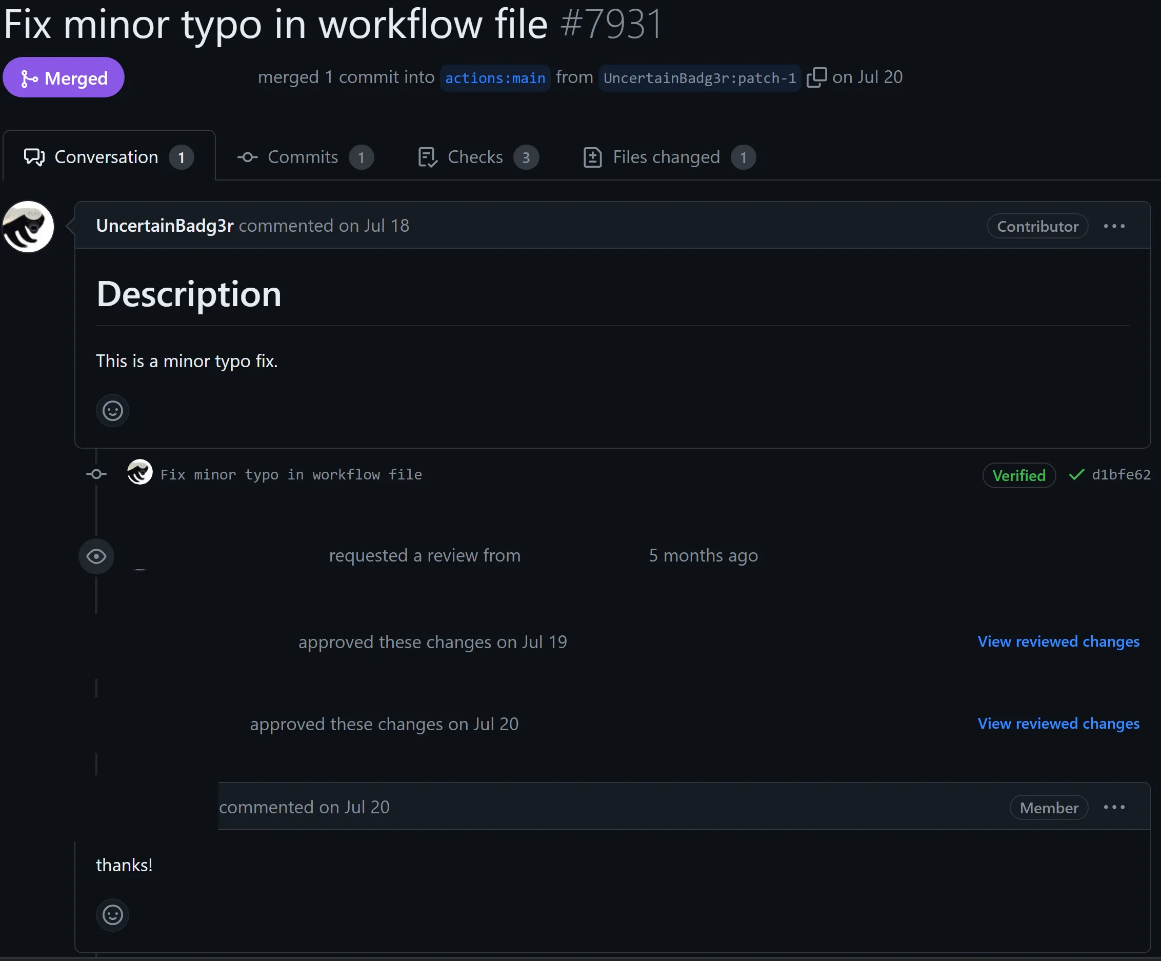 Once the pull request was merged, my account was a contributor, note the ‘Contributor’ badge that now shows up in the box. This meant that my account could execute workflows on pull_request without approval, as long as the repository had the default approval setting, which it did at the time.