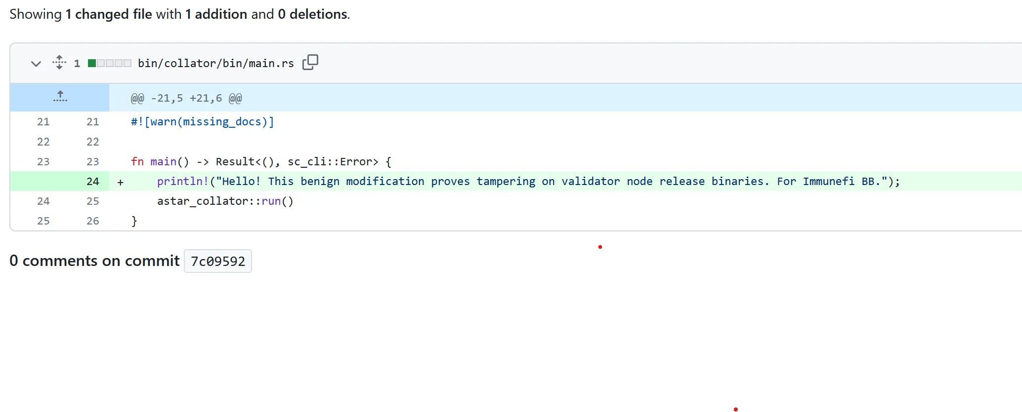 In hindsight, I should have added a different message. Even though this release was two weeks old, there was still a very small chance that someone would download the release, run this binary, and go tell a bunch of people that “Astar got hacked” before Astar had time to replace the binary in the period of time between uploading it and Astar removing it after my report. Furthermore, this was a low priority runtime-only release, with no modification to the clients (and I did not modify the runtimes as part of my POC). As you will see, I also aimed to submit the report immediately after the swap as to minimize this impact.