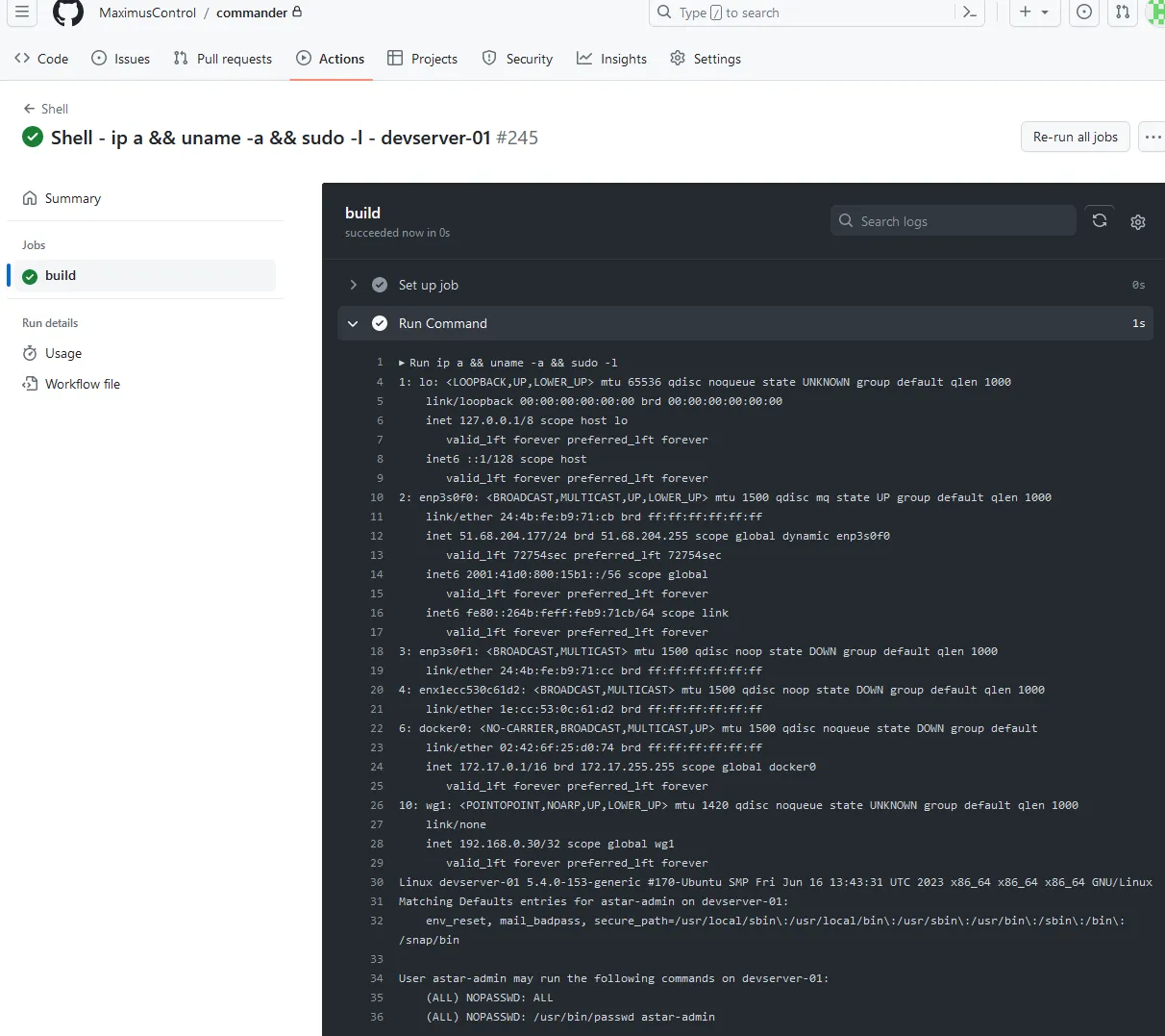 Since I determined that workflows on the pull_request trigger did not require approval for contributors, I pushed an updated workflow to deploy persistence on devserver-01. You can see that the workflow pulled from a Gist in order to install another self-hosted GitHub Actions runner on the machine. This is the runner-on-runner (RoR) technique that I first used when I discovered One Supply Chain to Rule Them All.