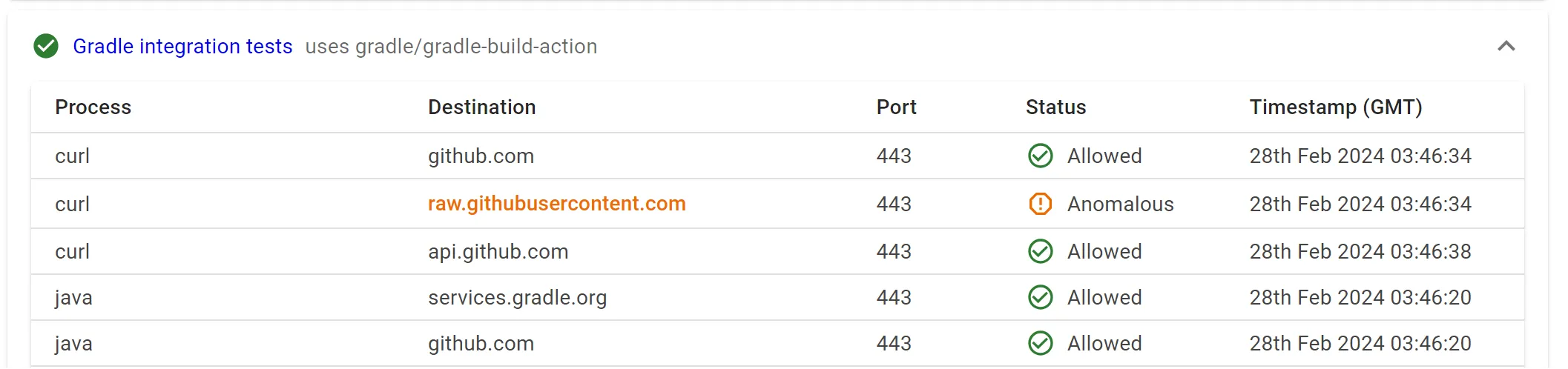 Harden-Runner actually did detect one anomalous request during my PoC, which was impressive. I had thought that using a commit from the base repository would have masked the behavior, but the issue was that the call to raw.githubusercontent itself was anomalous within that workflow as seen on the insights page. Had harden-runner been in block mode, it would have blocked the initial download of the payload and I would have had to scramble to update it to use a different method or just hardcode the full payload in the pull request.