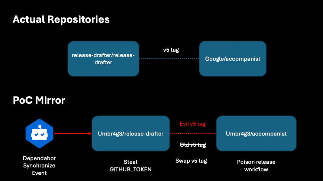 For this report, I could not conduct an attack against the upstream as that is not owned by Google. Instead, I created a complete mirror of both the Google/accompanist repository and the release-drafter/release-drafter repository. The mirror environment allowed me to simulate the full attack chain starting from the Dependabot confusion Pwn Request all the way to pushing a malicious tag with an exfiltration payload targeting the downstream repository.