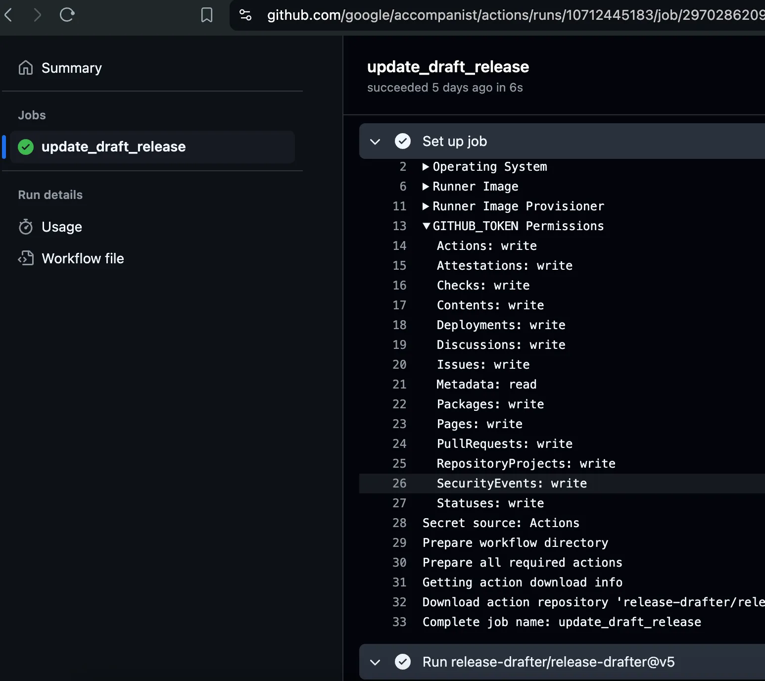 Now, let’s look at the Update release workflow within the google/accompanist repository. The workflow ran on every push to main and used the v5 version of the action.