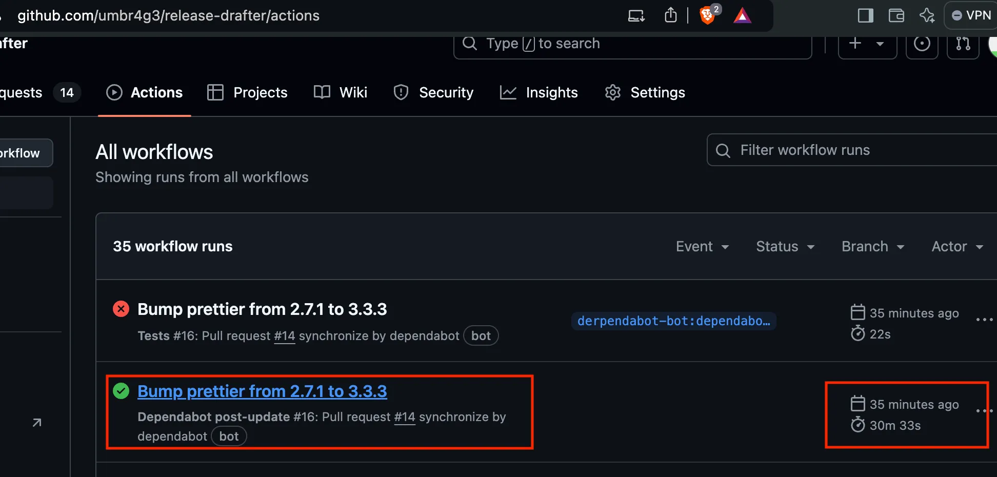 In my mirror of the release-drafter repository, I used a GITHUB_TOKEN exfiltration payload followed by a sleep for 30 minutes. Note the workflow run time and that the synchronize event came from dependabot. My “attacker” account in this case was named “derpendabot-bot”.