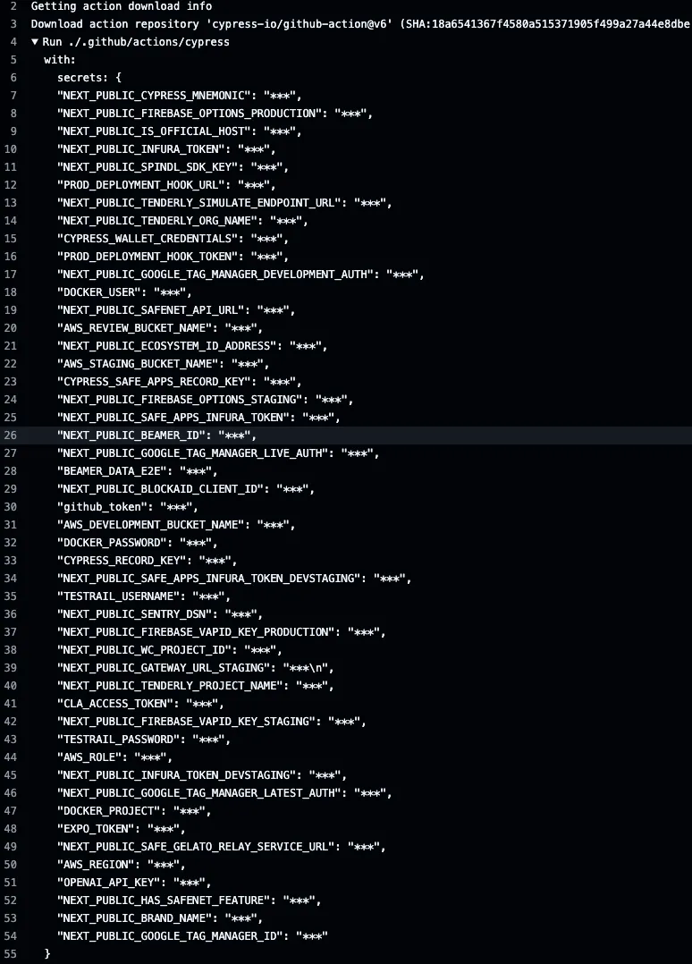 We can confirm this by looking at the run logs. GitHub does not show the secrets, but now we know the names of all secrets the repository can access.