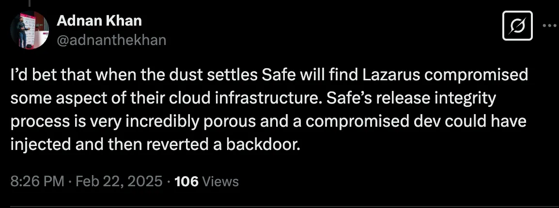 It turns out, that’s exactly how it happened. The preliminary report by Verichains confirmed that Lazarus used a compromised Safe credential to replace a set of Javascript files with a backdoor.